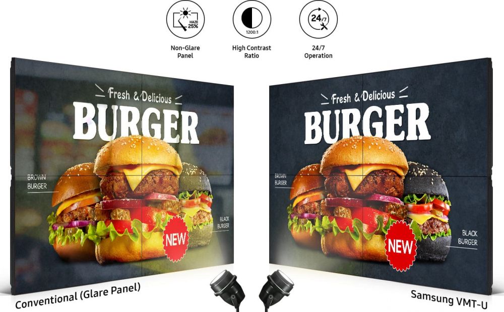 Tenha uma experiência de visualização imersiva e confiável, 24 horas por dia, 7 dias por semana com a série VMT-U da Samsung. A profundidade fina da tela e o brilho de 500 nit garantem imagens altamente visíveis e mensagens legíveis em uma ampla variedade de locais, desde shopping centers a lobbies, salas de reuniões, salas de controle e muito mais.