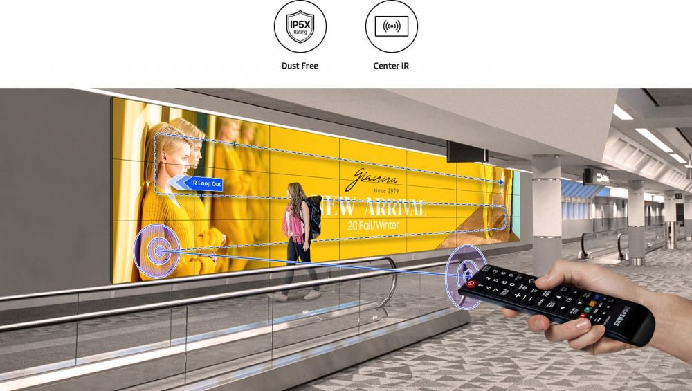 Com certificação IP5x, a série VMT-U é resistente à poeira e capaz de suportar uma variedade de condições ambientais sem a necessidade de preparar gabinetes adicionais em locais empoeirados. Um receptor infravermelho (IR) integrado e localizado centralmente permite um controle do usuário mais fácil e flexível para a tela.