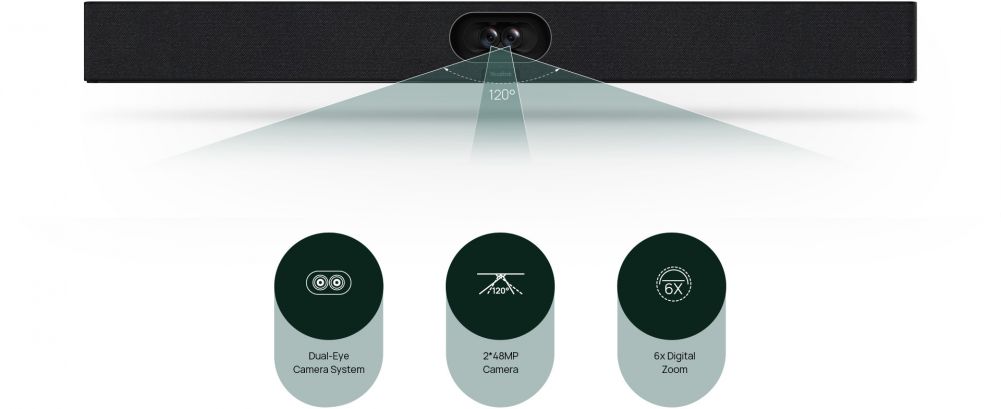 O sistema de câmera dual-eye garante nitidez de imagem excepcional. Com lentes direcionadas para cada lado dos participantes, ele oferece um ângulo de visão superior, enquanto suas câmeras de 48 MP cobrem longas distâncias sem esforço, fornecendo imagens de alta resolução mesmo a longas distâncias.